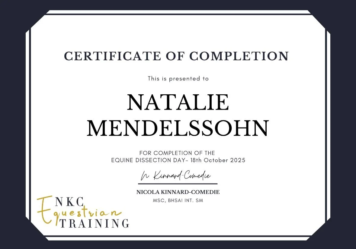Continuing Professional Development has enabled Natalie to continue to grow in her knowledge and remain up to date with developments including attending training days such as Rider Psychology run by Flying Changes Coaching as well as attended lectures and demonstrations such as Monty Roberts at Merrist Wood College and Charles de Kunffy at Training Teachers of Tomorrow as well as Alice Oppenheimer, William Fox-Pitt and many others. Natalie is pleased to have earned the Duty to Care badge from UkCoaching - learning and knowledge checks based on 5 key pillars; Safeguarding, Inclusion, Diversity, Well-being and Mental Health.